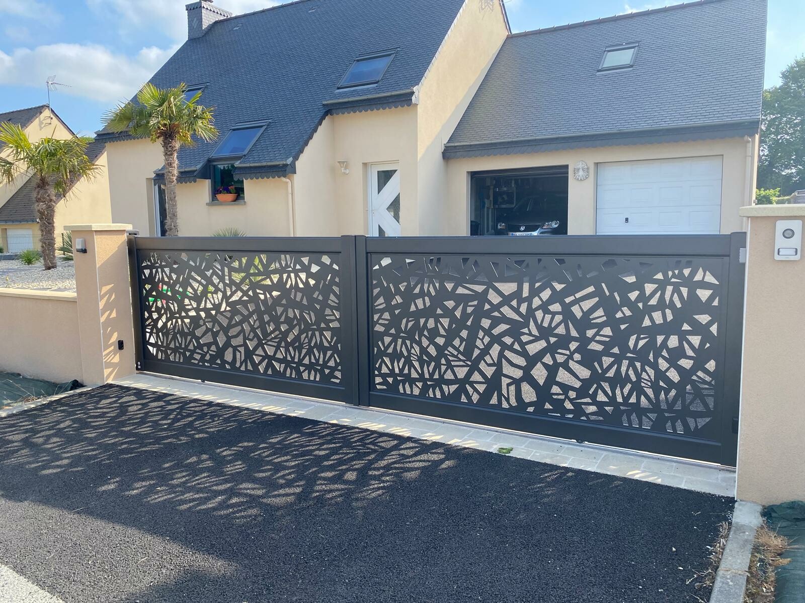 Installation de ce portail de jardin coulissant en aluminium. Son décor en découpe laser apporte une touche contemporaine tout en laissant passer la lumière et en créant un jeu d’ombres au sol.